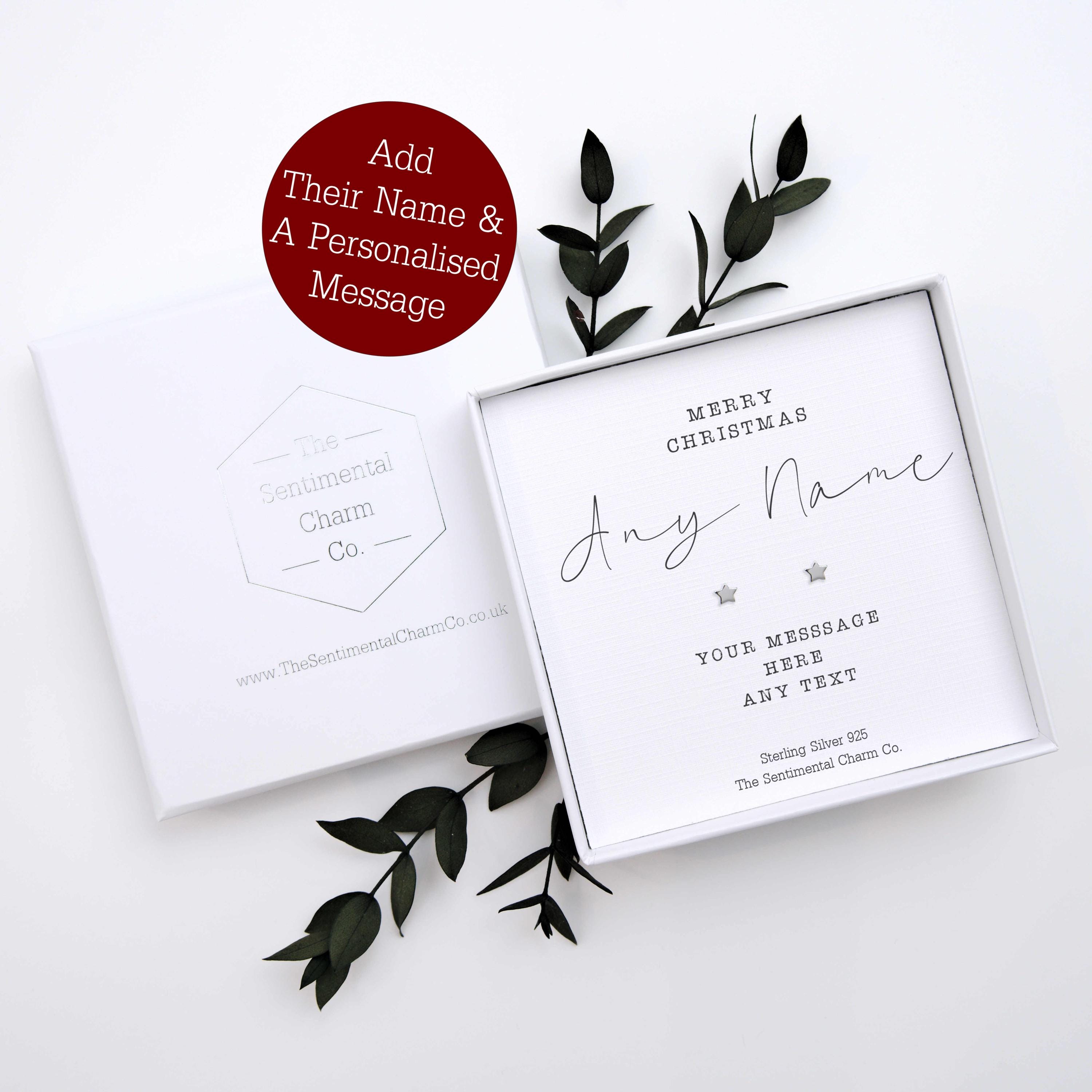 Personalised Christmas gift for your cousin. Sterling Silver 925 stud earrings with festive message. A simple, meaningful Xmas jewellery present.